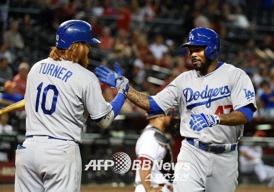 | LA 다저스 호위 켄드릭이 1일(한국시각) 애리조나 다이아몬드백스전에서 연장 10회초 솔로홈런을 터뜨린 뒤 저스틴 터너의 축하를 받고 있다. 다저스는 연장 10회 끝에 6대4로 승리했다. ⓒAFPBBNews = News1 |