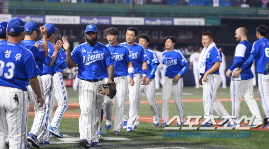 1일 목동구장에서 KBO리그 넥센과 삼성의 경기가 열렸다. 10회 연장전 끝에 삼성이 넥센에 13대 10으로 승리했다. 경기 종료 후 하이파이브를 나누고 있는 삼성 선수들. 목동=송정헌 기자 songs@sportschosun.com/2015.07.01 |