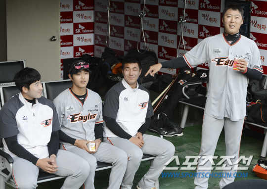 한화 이글스와 SK 와이번스의 2015 프로야구 경기가 20일 인천구장에서 열린다. 경기 전 한화 배영수가 김민우 등 신인선수들을 가리키며 '한화의 미래'라며 추켜세우고 있다. 인천=정재근 기자 cjg@sportschosun.com/2015.05.20/