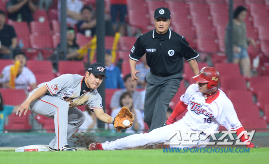 여기서부터 '김주찬 쇼'가 펼쳐졌다. 김기현이 후속타자 브렛 필을 상대할 때다. 볼카운트 1B2S에서 4구째 바깥쪽 커브가 너무 크게 휘었다. 한화 포수 허도환이 원바운드 된 공을 블로킹하려 했지만, 오른쪽 어깨에 맞고 뒤로 흘렀다. 그러자 김주찬은 득달같이 2루로 뛰었다. 당연한 수순이다. 그런데 여기서 멈추지 않았다. 김주찬은 달려오던 스피드를 그대로 살려 3루까지 뛰었고 안전하게 세이프됐다. 이게 바로 김주찬과 다른 선수의 차이점이다.