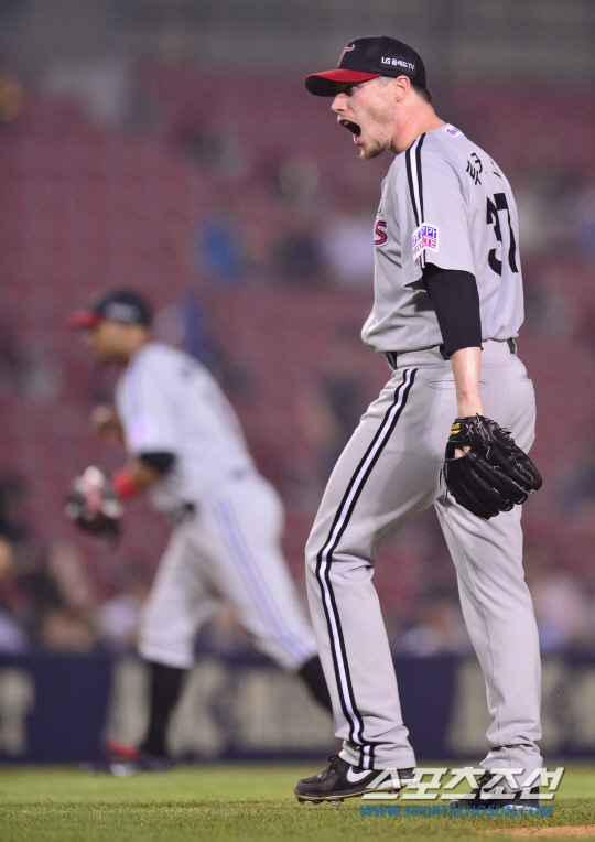 2일 오후 서울 잠실야구장에서 2015 프로야구 LG와 두산의 경기가 열렸다. 7회말 2사 1루서 두산 정수빈을 내야 땅볼 처리 한 LG 루카스가 환호하고 있다. 잠실=김경민 기자 kyungmin@sportschosun.com