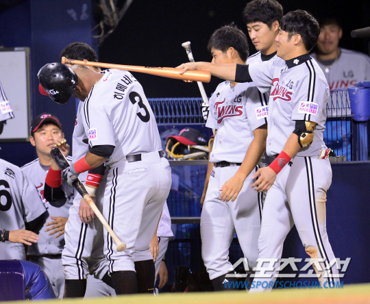 2일 오후 서울 잠실야구장에서 2015 프로야구 LG와 두산의 경기가 열렸다. 6회초 1사 1루서 LG 히메네스가 좌월 2점 홈런을 친 후 양석환의 방망이 세례를 받고 있다. 잠실=김경민 기자 kyungmin@sportschosun.com / 2015.07.02.