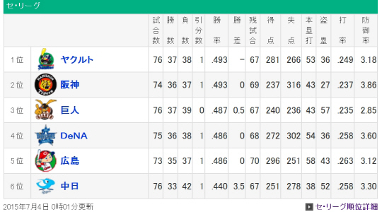 3일 경기가 없었던 요미우리는 37승39패(승률 0.487)로 3위, 요코하마가 36승1무38패(승률 0.4864)로 4위, 히로시마가 35승1무37패(승률 0.4861)로 5위다.
