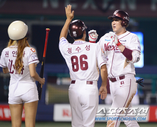 ◇1일 목동구장에서 KBO리그 넥센과 삼성의 경기가 열렸다. 넥센 유한준이 6회 삼성 클로이드를 상대로 솔로홈런으 날렸다. 홈에서 정수성 코치와 하이파이브를 나누고 있는 유한준. 목동=송정헌 기자 songs@sportschosun.com/2015.07.01 |