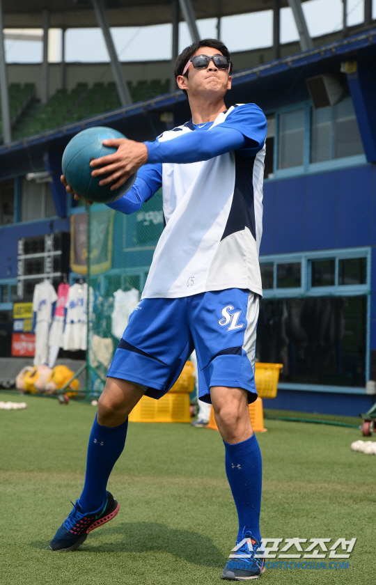2015 KBO리그 삼성라이온즈와 LG트윈스의 경기가 4일 대구시민운동장에서 열렸다. 경기전 삼성 구자욱이 메디신 볼을 이용해 근력훈련을 하고있다. 대구=최문영 기자 deer@sportschosun.com /2015.07,04/