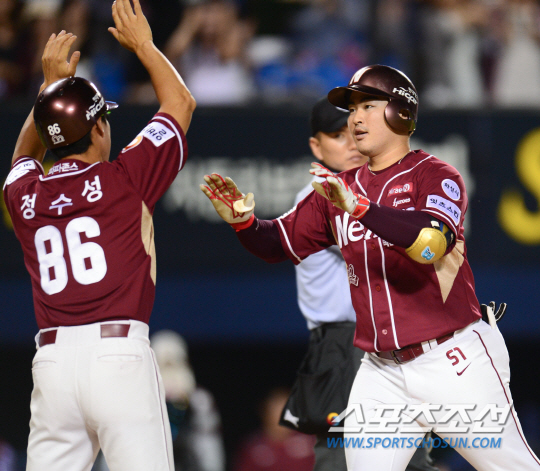 프로야구 넥센 히어로즈와 두산 베어스의 주말 3연전 3차전이 5일 잠실구장 열렸다. 8회초 2사 2루 넥센 박헌도가 역전 투런 홈런을 치고 홈인하며 정수성 코치의 축하를 받고 있다. 넥센 선발투수로 2승 1패 방어율 5.73의 김택형을 내세웠다. 두산에서는 2승 방어율 0.47의 허준혁이 선발 등판했다. 잠실=정재근 기자 cjg@sportschosun.com/2015.07.05/