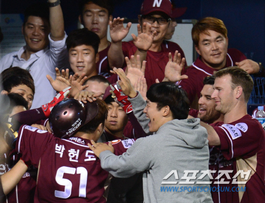 프로야구 넥센 히어로즈와 두산 베어스의 주말 3연전 3차전이 5일 잠실구장 열렸다. 8회초 2사 2루 넥센 박헌도가 역전 투런 홈런을 치고 들어와 동료들의 축하를 받고 있다. 넥센 선발투수로 2승 1패 방어율 5.73의 김택형을 내세웠다. 두산에서는 2승 방어율 0.47의 허준혁이 선발 등판했다. 잠실=정재근 기자 cjg@sportschosun.com