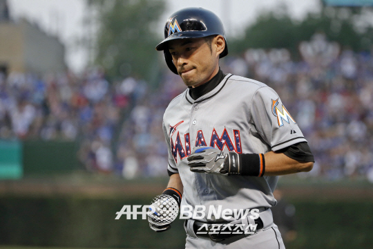 5일 시카고 컵스전 6회 대타로 나서 3루수 땅볼로 물러난 마이애미 말린스의 스즈키 이치로. ⓒAFPBBNews = News1