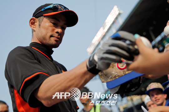 이치로가 시카고 컵스전에 앞서 팬들의 사인요청에 응하고 있다. ⓒAFPBBNews = News1