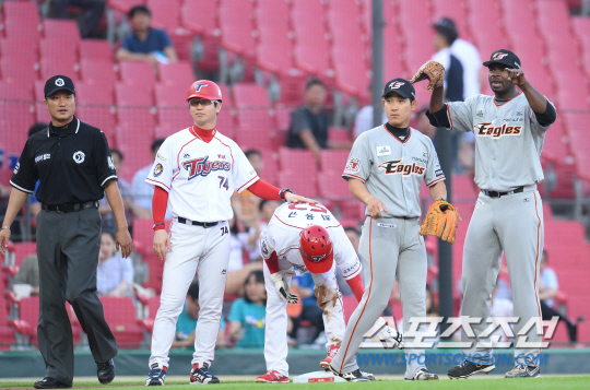 ◇2015 KBO리그 KIA타이거스와 한화이글스의 경기가 지난 1일 광주기아챔피언스필드에서 열렸다. KIA 2회말 1사 2루 김호령 타석때 2루주자 최용규의 도루시도가 세이프 판정을 받자 한화 유먼이 합의판정을 요구하고 있다. 광주=최문영 기자 deer@sportschosun.com /2015.07,01/