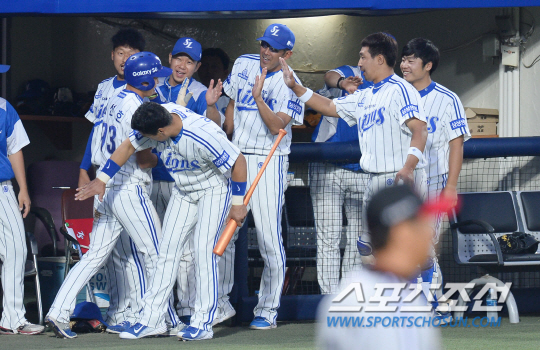 ◇지난 5일 LG트윈스와의 경기에서 4회말 1사 2루에서 삼성 최선호가 구자욱의 적시타때 홈을 밟고 있다. 이승엽이 후배의 엉덩이를 툭툭 치며 격려하고 있다. 대구=최문영 기자 deer@sportschosun.com