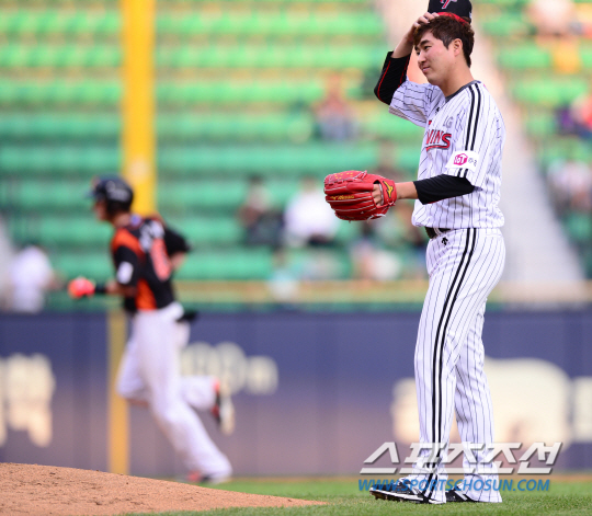 2015 프로야구 LG와 롯데의 주중 3연전 첫 경기가 7일 잠실 야구장에서 펼쳐 졌다. LG 선발 우규민이 3회 롯데 아두치에게 선두타자 홈런을 허용하고 아쉬워 하고 있다. 잠실=조병관기자 rainmaker@sportschosun.com/2015.07.07/ |