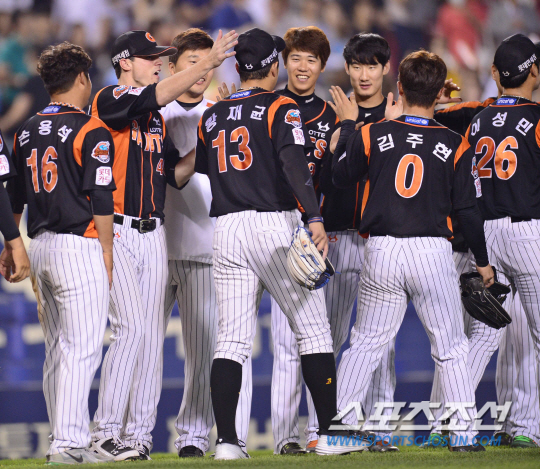 2일 오후 서울 잠실야구장에서 2015 프로야구 LG와 두산의 경기가 열렸다. 7대 2로 승리한 후 LG 히메네스 등 선수들이 하이파이브를 나누고 있다. 잠실=김경민 기자 kyungmin@sportschosun.com / 2015.07.02.