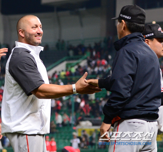 21일 인천 SK행복드림구장에서 KBO리그 SK와 한화의 주중 3연전 마지막 경기가 열렸다. 한화가 SK에 7대1로 승리했다. 경기 종료후 하이파이브를 나누고 있는 한화 선수들. 김성근 감독과 하이파이브를 나누고 있는 폭스. 인천=송정헌 기자 songs@sportschosun.com/2015.05.21 |