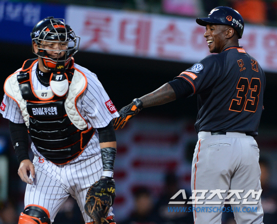 10일 부산사직구장에서 KBO리그 롯데 자이언츠와 한화 이글스의 주말 3연전 첫 번째 경기가 열렸다. 한화 배영수와 롯데 심수창이 선발 맞대결을 펼쳤다. 한화 모건이 2회 2사 1,2루에서 롯데 심수창에게 삼진을 당했다. 강민호를 향해 웃음을 보이고 있는 모건. 부산=송정헌 기자 songs@sportschosun.com/2015.04.10 |