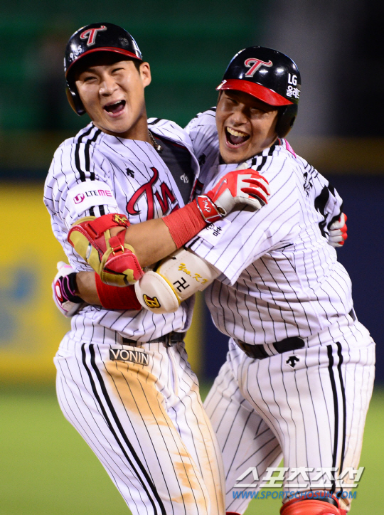2015 프로야구 LG와 롯데의 주중 3연전 이틀째 경기가 8일 잠실 야구장에서 펼쳐 졌다. 연장 11회말 1사 만루에서 LG 오지환이 끝내기 안타를 치고 동료들과 뒤엉켜 좋아하고 있다. 잠실=조병관기자 rainmaker@sportschosun.com/2015.07.08/