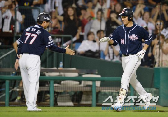 두산은 풍부한 야수진을 자랑한다. 최근 1군에 올라온 고영민이 유민상 대신 대타로 나섰다. 권 혁의 낮은 패스트볼을 그대로 걷어올리며 솔로홈런.