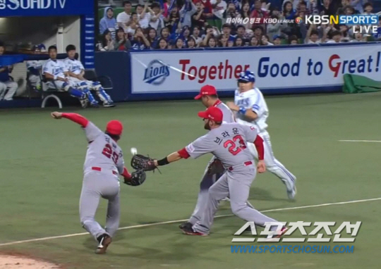 삼성의 4회말 공격. 박석민의 행운의 내야 안타 때 홈을 파고들던 최형우를 SK 선발 김광현이 태그아웃했다. 하지만 TV 리플레이에서는 원바운드된 공이 김광현이 아닌 브라운의 글러브로 들어가는 것이 확인됐다. KBSN스포츠 화면 캡쳐