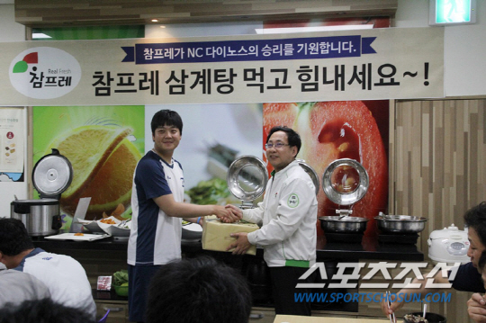 마산구장을 찾은 참프레 조성욱 마케팅 이사는 "NC 다이노스의 전력질주에 참프레가 함께 할 수 있어 기쁘다. 삼계탕 한 그릇이 아닌 선수단을 응원하는 마음으로 정성스레 준비했다. 시즌이 마칠 때까지 좋은 모습 보여주길 기대한다"고 말했다.
