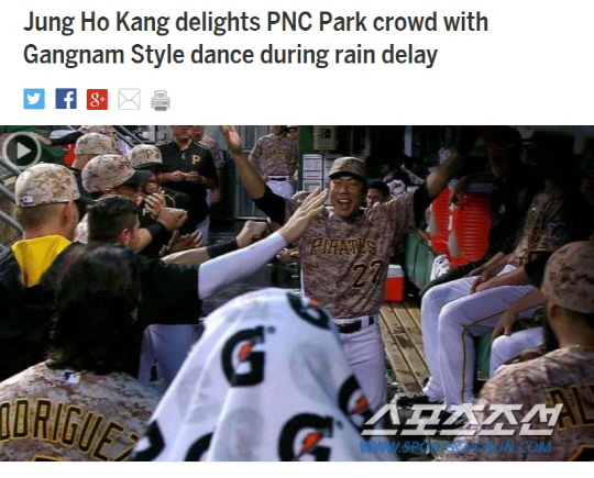 ◇메이저리그 홈페이지(MLB.com)가 10일(한국시각) 피츠버그 PNC파크에서 열린 피츠버그-세인트루이스전이 우천으로 일시 중단됐을 때 강정호가 덕아웃에서 '강남스타일 말춤'을 춰 관중을 즐겁게 했다고 보도했다. 사진=메이저리그 홈페이지 캡처