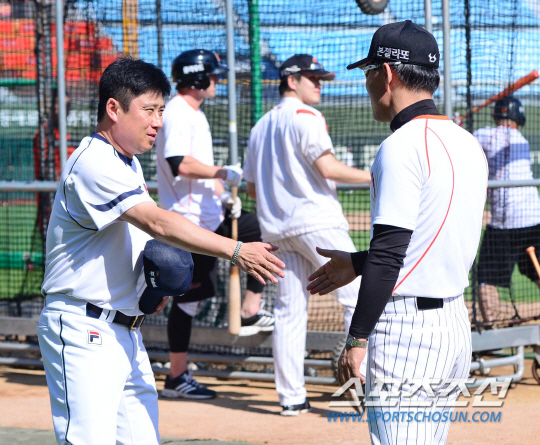 10일 오후 부산 사직야구장에서 열릴 2015 프로야구 두산과 롯데의 경기에 앞서 두산 김태형 감독이 롯데 이종운 감독과 악수를 나누고 있다. 부산=김경민 기자 kyungmin@sportschosun.com / 2015.07.10. |
