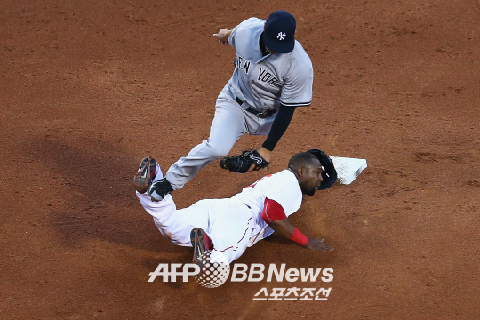 뉴욕 양키스의 한국계 미국인 롭 레프스나이더(왼쪽)가 12일(한국시각) 보스턴 펜웨이파크에서 열린 보스턴과의 원정경기에서 3회말 알레한드로 데 아자의 2루 도루 시도를 막으려 하고 있다. 이 경기는 레프스나이더의 메이저리그 데뷔전이었다. ⓒAFPBBNews = News1
