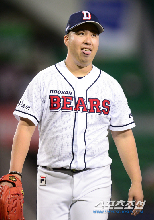 2015 프로야구 KT 위즈와 두산 베어스의 주중 3연전 2차전이 15일 잠실구장에서 열렸다. 6회초 2사 만루 KT 박경수를 좌익수 플라이로 아웃시키며 이닝을 마친 두산 유희관이 혀를 내밀며 안도하고 있다. KT는 선발투수로 4승 6패 방어율 3.66의 정대현을 내세웠다. 두산 베어스에서는 11승 2패 방어율 3.48의 유희관이 선발 등판했다. 잠실=정재근 기자 cjg@sportschosun.com/2015.07.15/
