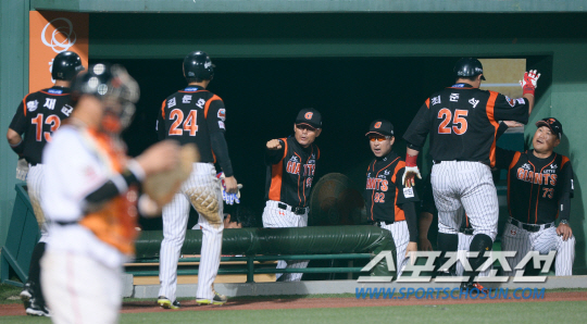 15일 충북 청주야구장에서 KBO리그 한화 이글스와 롯데 자이언츠의 주중 두 번째 경기가 열렸다. 5회 롯데 최준석이 한화 박정진을 상대로 역전 3점홈런을 날렸다. 덕아웃에서 이종운 감독과 하아파이브를 나누고 있는 최준석. 청주=송정헌 기자 songs@sportschosun.com/2015.07.15