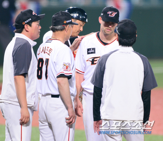 그러나 롯데 불펜은 1점의 리드를 지키지 못했다. 곧바로 7회말에 동점을 허용한 것. 정근우의 유격수 쪽 내야안타에 이어 도루와 폭투로 2사 3루가 됐다. 롯데 두 번째 투수 심수창은 결국 여기서 김태균에게 동점 적시타를 얻어맞았다.