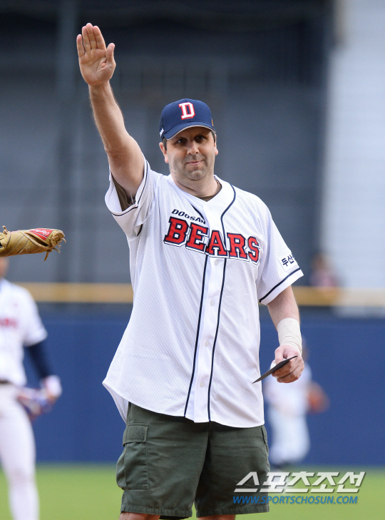 2015 KBO리그 두산베어스와 롯데자이언츠의 경기가 18일 서울잠실야구장에서 열렸다. 경기전 주한미국대사 리퍼트 기념시구를 하고 있다. 지난달 5일 서울 세종문화회관 조찬 강연장에서 습격을 받아 치료를 받아온 리퍼트 대사는 최근 다친 왼손에 착용했던 치료 보조기와 붕대를 풀었다. 잠실=최문영 기자 deer@sportschosun.com