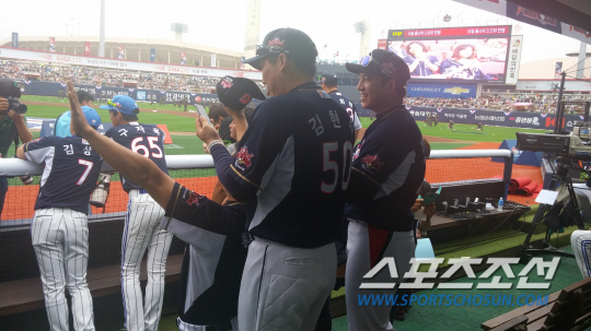 황재균, 김현수(두산 베어스), 장시환(kt 위즈)은 휴대폰을 통해 경기장 구석구석을 류현진에게 보여주며 안부를 나눴다. 전화기를 통해 보여진 류현진의 표정도 매우 밝고 즐거워보였다.