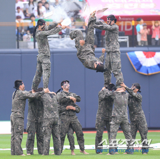 하지만 3군 사령부 태권도 시범은 예정대로 진행돼 팬들로부터 큰 박수를 받았다. 선수들도 덕아웃에 나와 화려한 격파 등 태권도 시범을 보며 "정말 멋있다"고 감탄사를 내뱉었다.