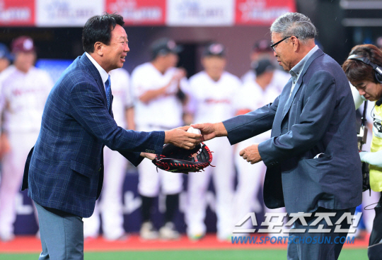 2015 프로야구 올스타전이 18일 수원 KT위즈 파크에서 열렸다. 경기 전 시포를 맡은 선동열 감독이 시구를 맡은 김응용 감독에게 볼을 전달하고 있다. 2015 올스타전은 팬사인회와 번트왕 선발대회등 다채로운 식전행사에 이어 드림올스타(삼성, SK, 두산, 롯데, kt)와 나눔올스타 (넥센, NC, LG, KIA, 한화)의 경기로 펼쳐진다. 수원=김경민 기자 kyungmin@sportschosun.com / 2015.07.18. |