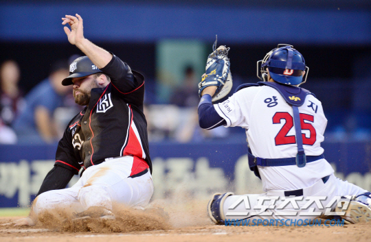 14일 오후 서울 잠실야구장에서 2015 프로야구 KT와 두산의 경기가 열렸다. 5회초 무사서 3루서 3루주자 KT 댄블랙이 김상현이 좌익수 플라이 때 홈까지 뛰어 세이프되고 있다. 잠실=김경민 기자 kyungmin@sportschosun.com / 2015.07.14.