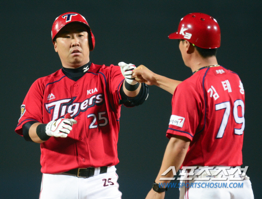| 2015 프로야구 KIA 타이거즈와 삼성 라이온즈의 주중 3연전 1차전이 21일 대구구장에서 열렸다. 6회초 1사 만루 KIA 이범호가 2타점 역전타를 친 후 김태룡 코치의 축하를 받고 있다. 대구=정재근 기자 cjg@sportschosun.com/2015.07.21/ |