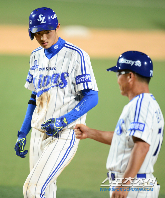 2015 프로야구 KIA 타이거즈와 삼성 라이온즈의 주중 3연전 2차전이 22일 대구구장에서 열렸다. 8회말 2사 삼성 구자욱이 안타를 치고 나가 김평호 코치의 축하를 받고 있다. 구자욱은 5타수 4안타 3타점 1볼넷 2득점의 맹활약을 펼쳤다.대구=정재근 기자 cjg@sportschosun.com/2015.07.22/