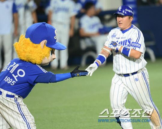 2015 프로야구 KIA 타이거즈와 삼성 라이온즈의 주중 3연전 2차전이 22일 대구구장에서 열렸다. 6회말 무사 삼성 최형우가 우월 솔로포를 치고 들어오며 마스코트 블레오의 축하를 받고 있다. 대구=정재근 기자 cjg@sportschosun.com/2015.07.22/