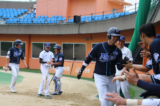 | 22일 경기에서 2점 홈런을 때린 배승현 이 덕아웃 앞에서 동료들과 하이파이브를 하고 있다. 사진제공=연천 미라클 |