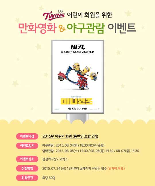 LG 트윈스가 여름방학을 맞아 2015년 어린이회원을 대상으로 홈경기와 만화영화를 한꺼번에 즐길 수 있는 이벤트를 실시한다.