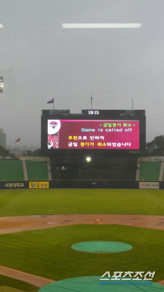 계속 내리는 비로 인해 경기 진행이 어렵다고 판단, 오후 4시19분부로 경기 취소 결정이 내려졌다.