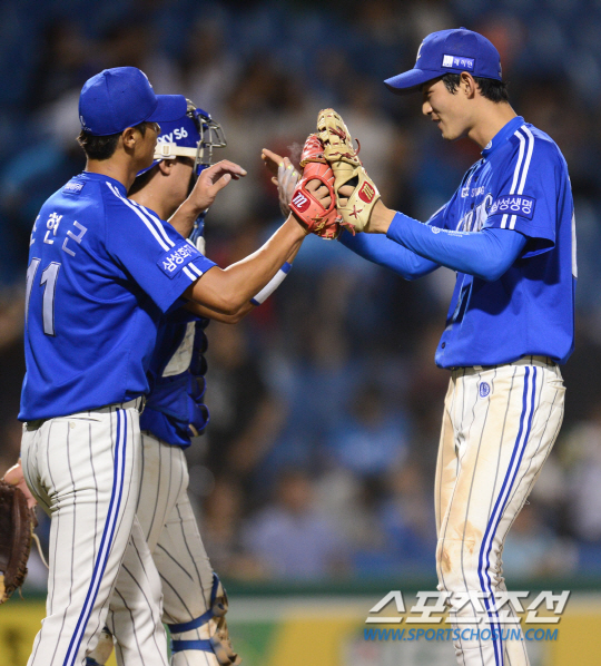 2015 프로야구 삼성 라이온즈와 한화 이글스의 주말 3연전 1차전이 24일 대전 한화생명이글스파크에서 열렸다. 8-3의 승리를 거둔 삼성 선수들이 승리를 자축하고 있다. 삼성은 선발투수로 6승 5패 방어율 4.50의 클로이드를 내세웠다. 한화에서는 3승 3패 방어율 6.60의 배영수가 선발 등판했다. 대전=정재근 기자 cjg@sportschosun.com/2015.07.24/ |