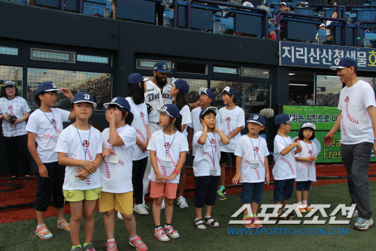 고성 애육원생은 애국가 이벤트에 참여했고 테임즈와 함께 기념 촬영을 했다. 여기에 그치지 않고 경기가 끝난 뒤 경매 이벤트로 500만원을 기부할 예정이다. 창원=류동혁 기자 sfryu@sportschosun.com