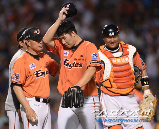 2015 프로야구 삼성 라이온즈와 한화 이글스의 주말 3연전 2차전이 25일 대전 한화생명이글스파크에서 열렸다. 5회초 2사 2루 삼성 구자욱 타석에서 한화 선발투수 김민우가 강판되고 있다. 김민우는 5회 2사까지 무안타 무실점으로 호투했다. 삼성은 선발투수로 5승 7패 방어율 7.65의 장원삼을 내세웠다. 한화에서는 1패 방어율 6.15의 김민우가 선발 등판했다. 대전=정재근 기자 cjg@sportschosun.com/2015.07.25/ |