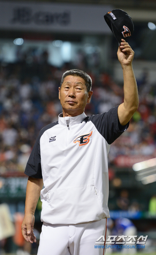 2015 프로야구 삼성 라이온즈와 한화 이글스의 주말 3연전 2차전이 25일 대전 한화생명이글스파크에서 열렸다. 한화가 짜릿한 2-1 승리를 거둔 가운데 김성근 감독이 팬들을 향해 모자를 벗고 인사하고 있다. 삼성은 선발투수로 5승 7패 방어율 7.65의 장원삼을 내세웠다. 한화에서는 1패 방어율 6.15의 김민우가 선발 등판했다. 대전=정재근 기자 cjg@sportschosun.com/2015.07.25/