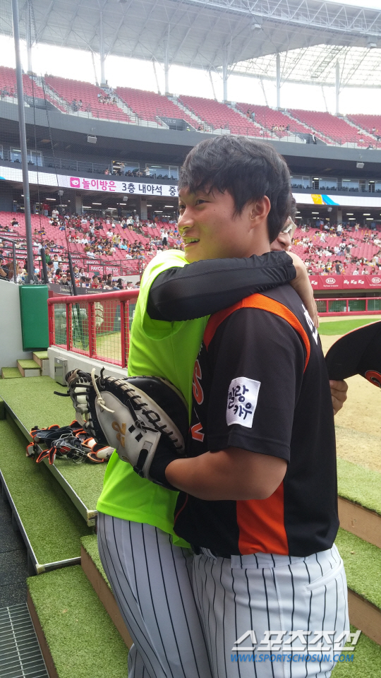 경기 전 안중열이 덕아웃에 모습을 드러냈다. 그러자 박세웅이 다가갔다. 그리고 "고맙다"고 말하며 안아줬다. 부산 사나이 안중열은 "이게 뭐꼬"를 외쳤다.