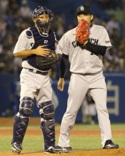 주니치의 다니시게 감독 겸 선수가 25일 야쿠르트전 7회 포수로 출전해 일본 프로야구 통산 최다 출전 타이 기록을 세웠다. 사진캡처=스포츠닛폰 홈페이지