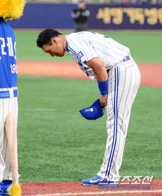 | ◇지난달 3일 포항구장에 열린 롯데-삼성전. 삼성 이승엽이 개인통산 400홈런을 친 뒤 꽃다발을 전해주고 축하를 해준 상대팀 롯데 덕아웃을 향해 모자를 벗고 90도로 감사인사를 하고 있다. 김경민 기자 kyungmin@sportschosun.com / 2015.06.03. |