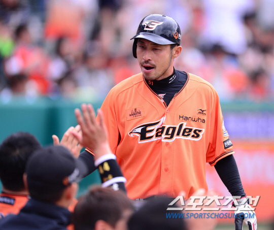 3일 오후 대전 한화생명 이글스파크에서 2015 프로야구 롯데와 한화의 경기가 열렸다. 3회말 무사 2루서 2루주자 김경언이 김태균의 적시타 때 홈에 들어와 동료들과 하이파이브를 나누고 있다. 대전=김경민 기자 kyungmin@sportschosun.com / 2015.05.03. |