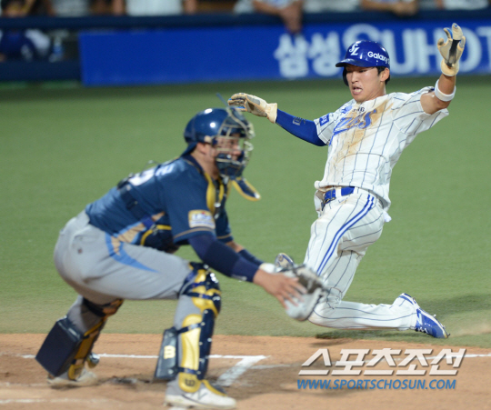 삼성과 NC의 2015 KBO 리그 주중 3연전 첫번째 경기가 28일 대구구장에서 열렸다. 6회말 1사 2루 삼성 나바로의 우익수 앞 적시타때 2루주자 박해민이 홈으로 파고들어 세이프되고 있다. NC 포수는 김태군. 대구=허상욱 기자 wook@sportschosun.com/2015.07.28/ |
