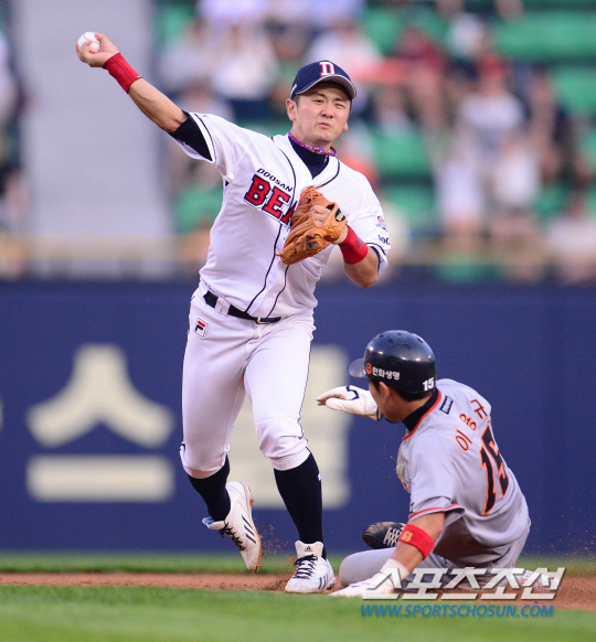 28일 오후 서울 잠실야구장에서 2015 프로야구 한화와 두산의 경기가 열렸다. 2회초 1사 1,2루서 1루주자 이용규가 장운호의 내야 땅볼 때 2루서 아웃되고 있다. 잠실=김경민 기자 kyungmin@sportschosun.com / 2015.07.28. |